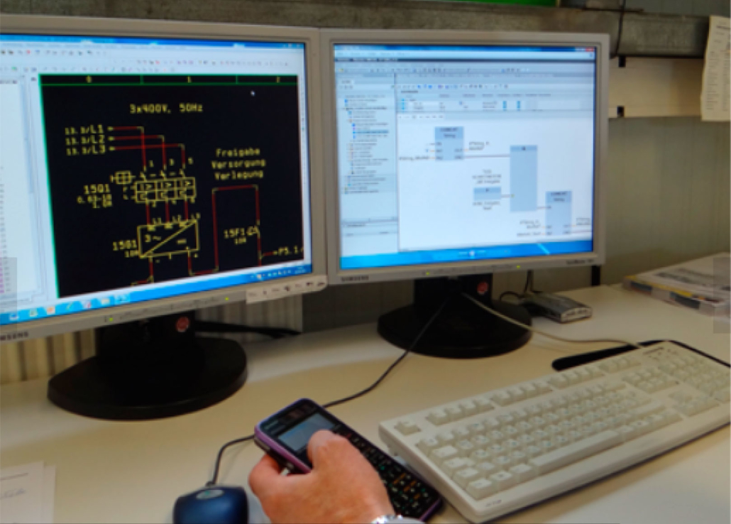 Schmidt has its own electrical workshop in which all control cabinets for drawing machines can be built. The control cabinet planning is done according to the most modern aspects on E-PLAN. All electronic devices such as PLC and frequency converters are programmed by our own automation engineer.