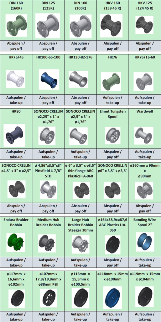 Die Tabelle zeigt die bisher möglichen Spulentypen. Bis 160 mm Durchmesser ist alles möglich!